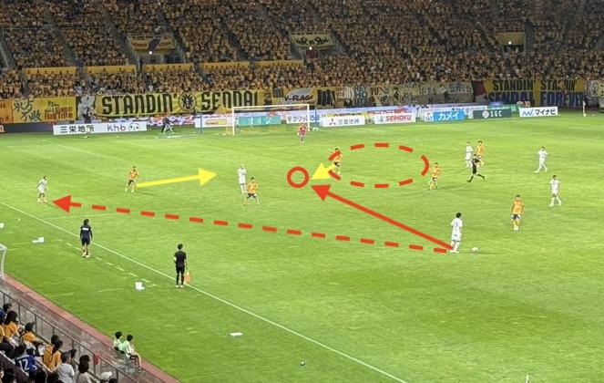 しかし、攻撃の改善にもかかわらず、鹿児島は仙台のペナルティエリア付近で苦戦しました。仙台の4-4-2ゾーンディフェンスがしっかり機能しており、鹿児島の選手はボールをライン間で受けることが難しく、最終的にはサイドでのセンタリングや無理な突破、もしくはボールを下げるしかない状況が続きました。結果として、得点に繋げることができず、仙台の守備を崩すことができませんでした。