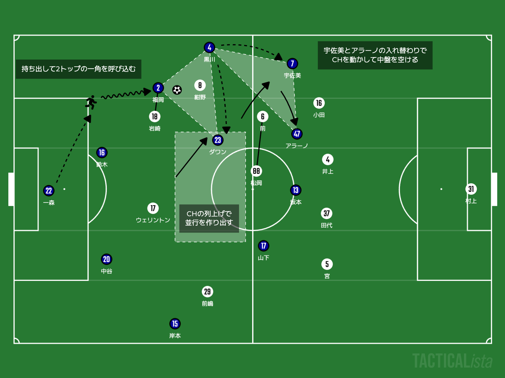 彼が動き過ぎたゆえに宇佐美選手や坂本選手のプレーエリアが制限されたのですが、アラーノ選手のプレーエリアをサイドとハーフスペースにしたので、宇佐美選手の列降りが可能になります。