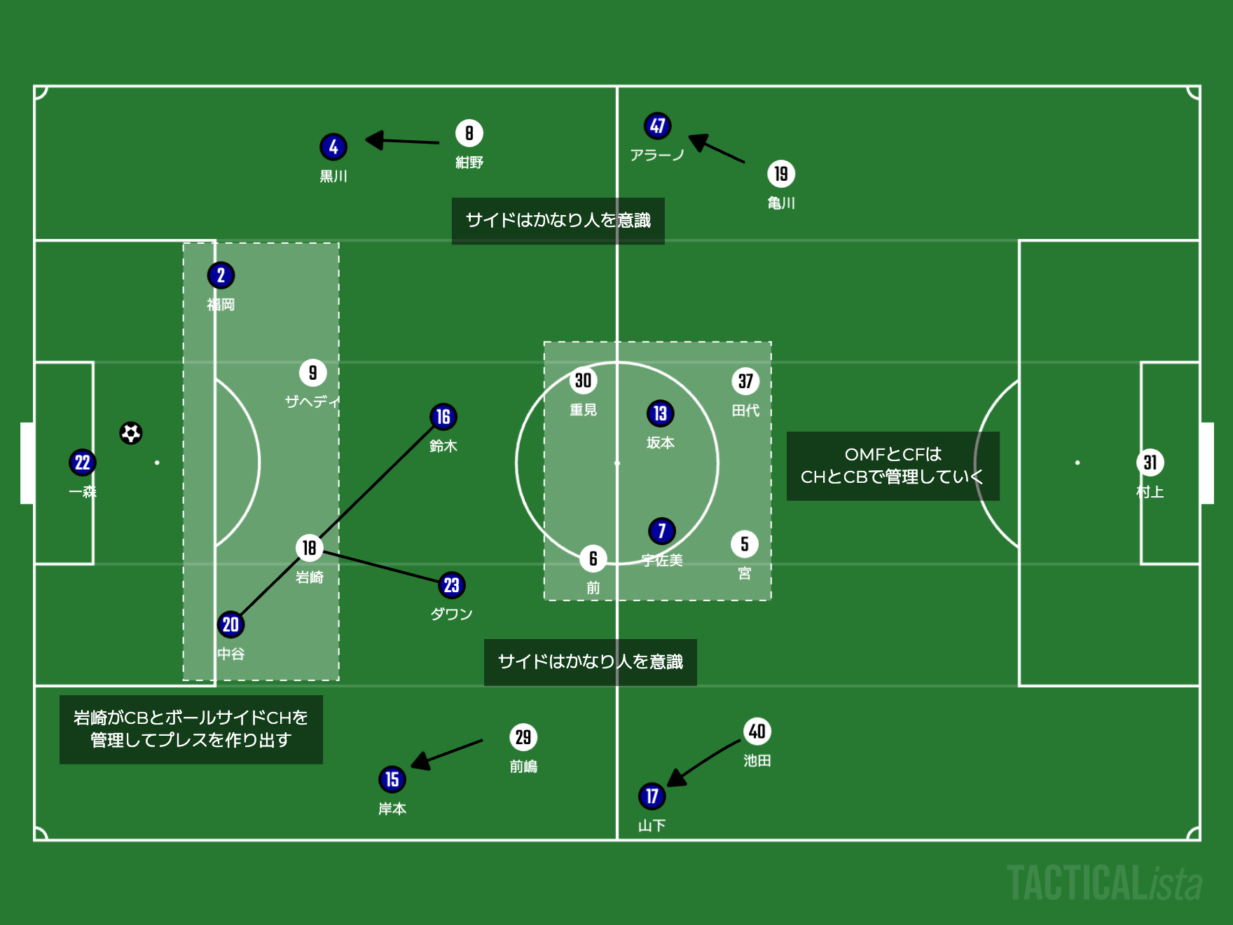 まず岩崎選手の走力を生かすところからハイプレスが始まります。この際のサイドプレーヤーはそれぞれ対面を意識していきます。そしてプレスの口火役としてザヘディ選手がそれを担うのですが、それを後ろでコントロールしていたのが岩崎選手です。彼がプレスのタイミングを指示してプレスを開始していきます。