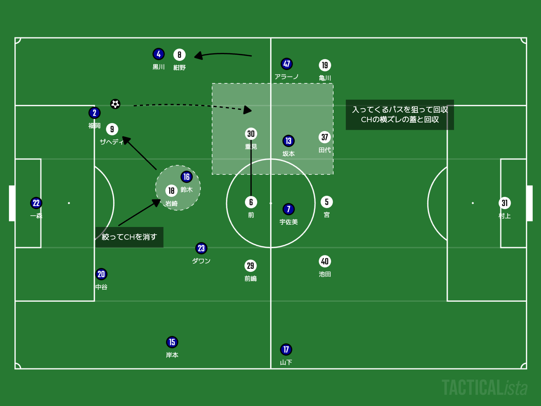 このように岩崎選手はCHまで下がり切る事によって、前選手と重見選手の「縦移動」のタスクを無くします。ここに大きな狙いがあったと僕は考えます。