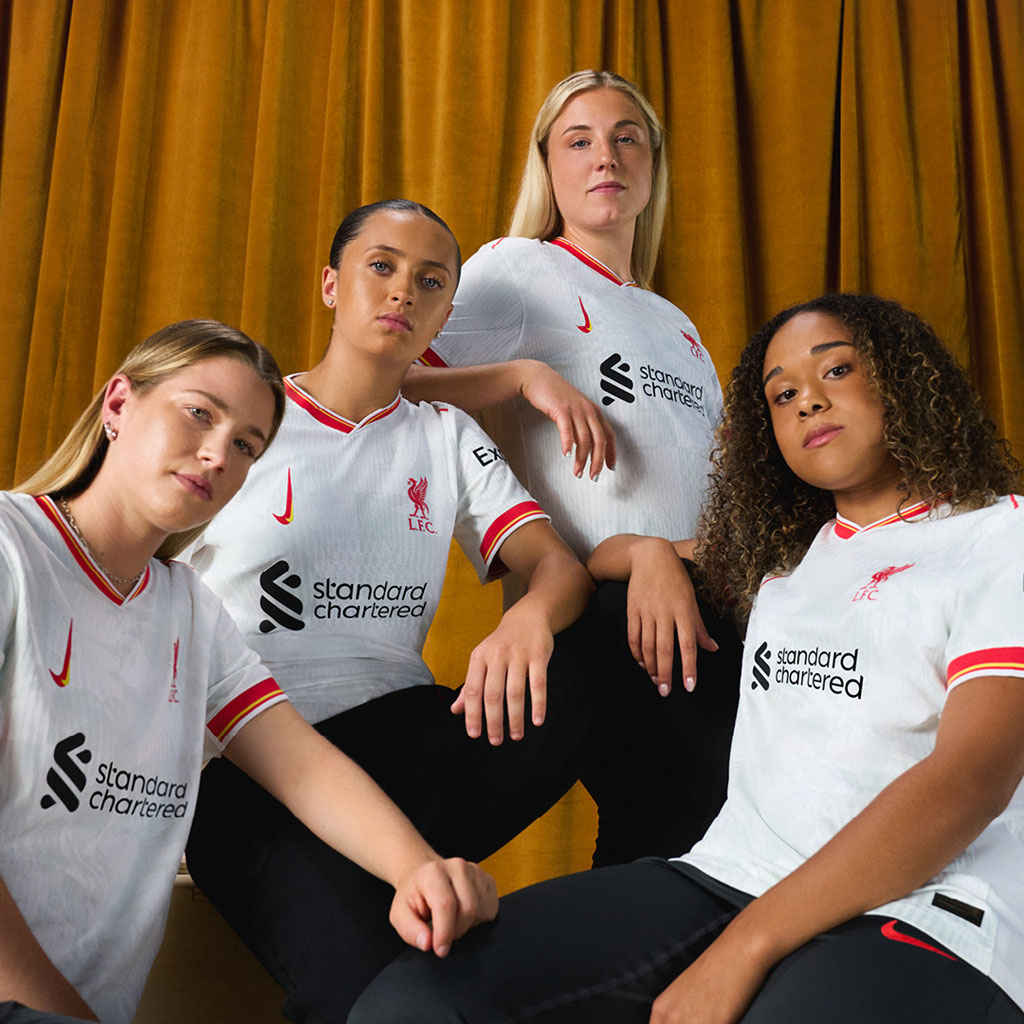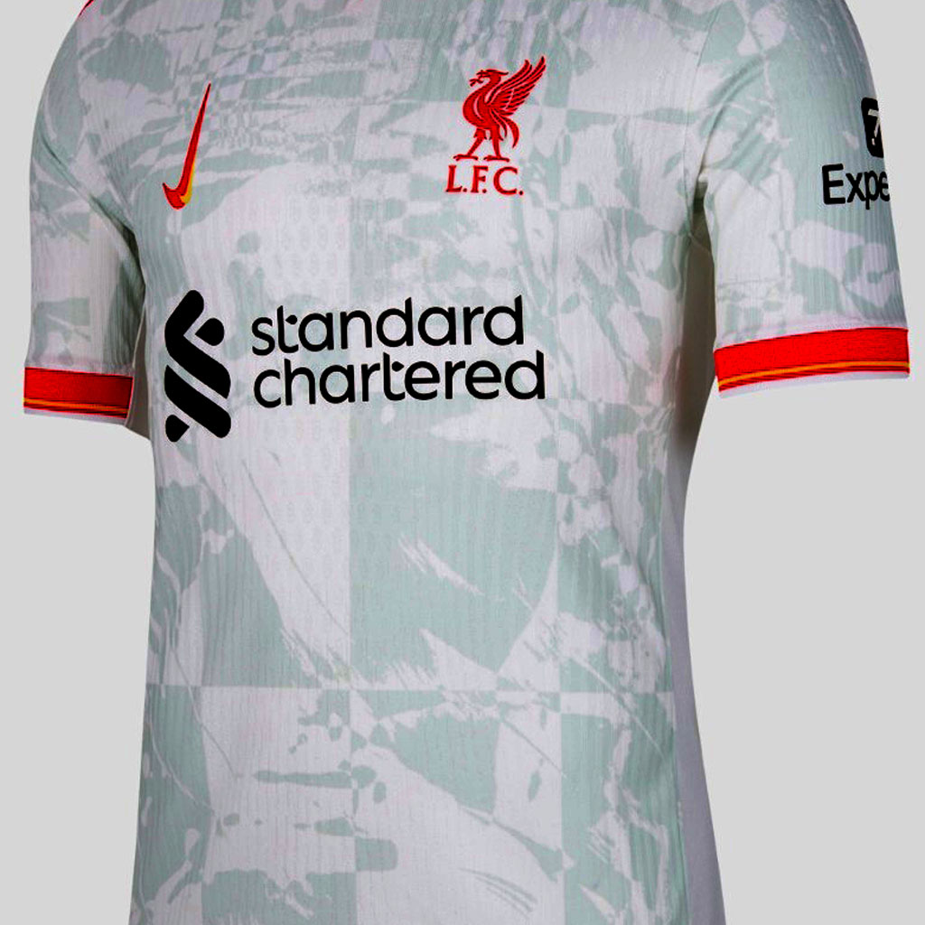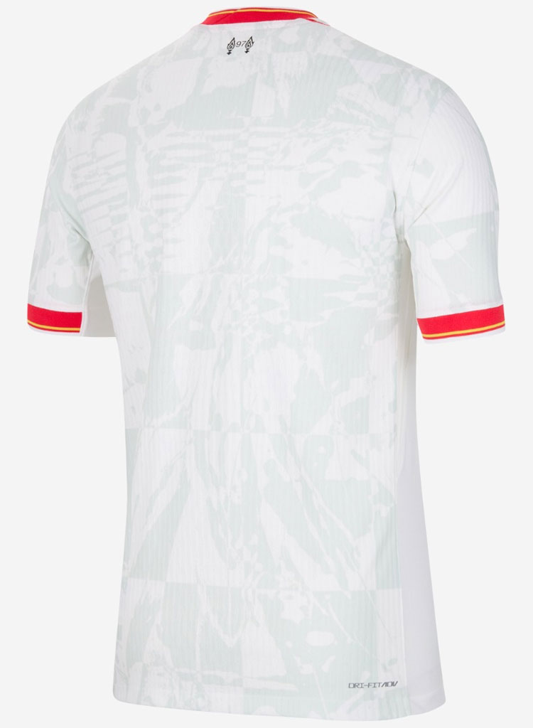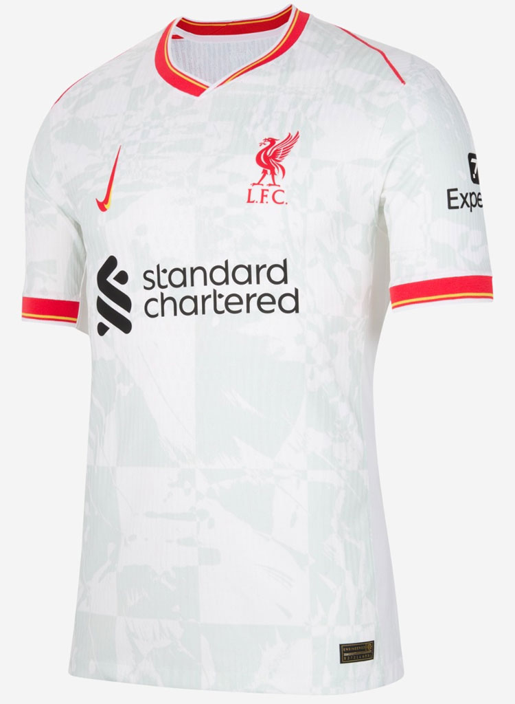 2024-25新サードユニフォームは、ホワイトを基調にレッド、イエロー、ブラックを組み合せたリヴァプールらしいカラーコンビネーションのデザインが登場。