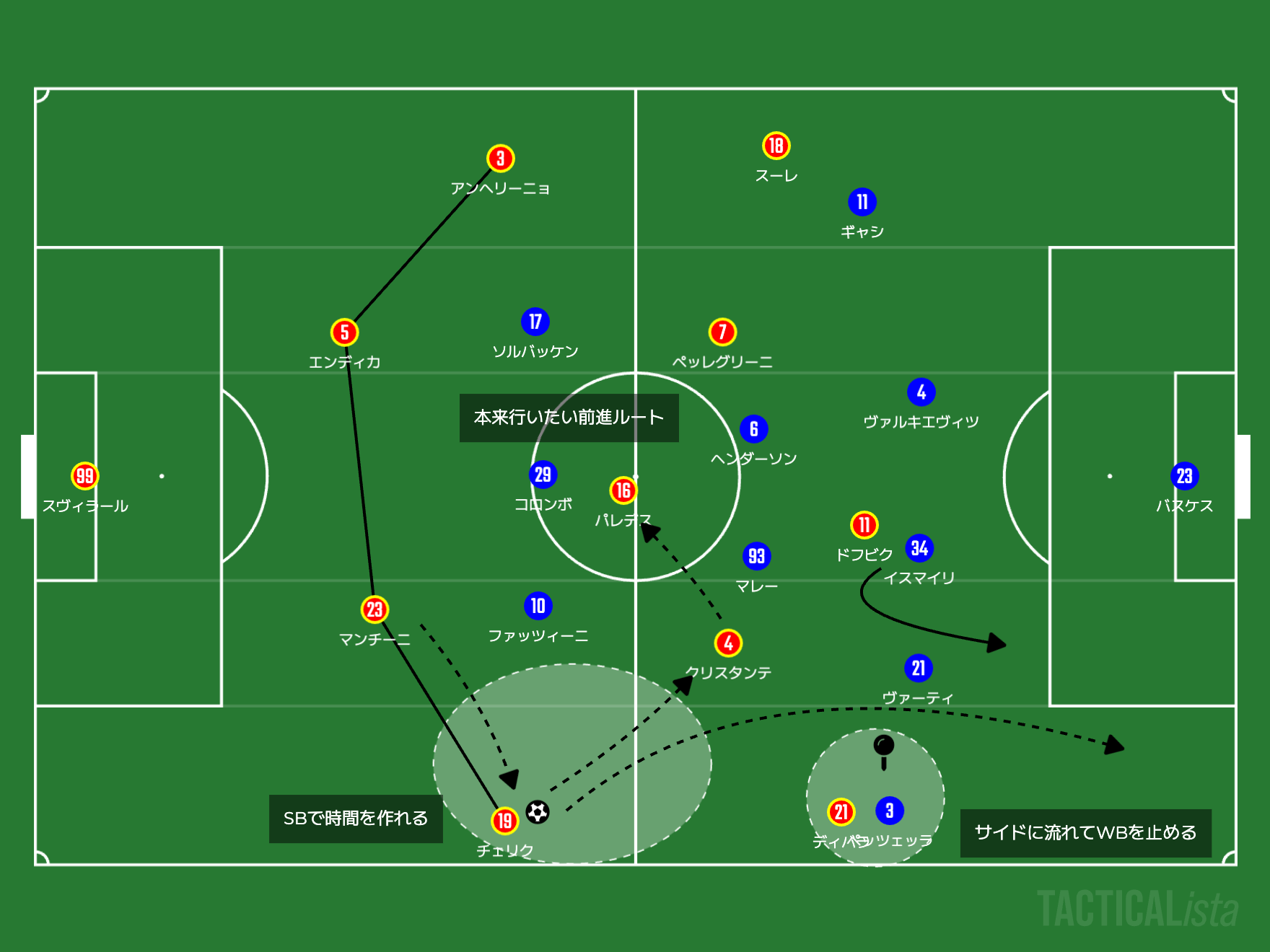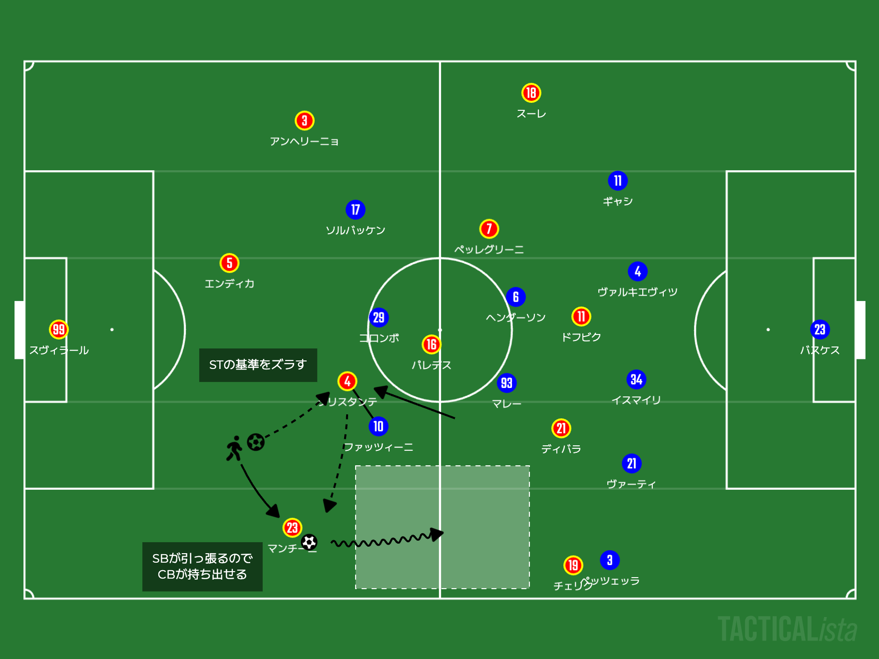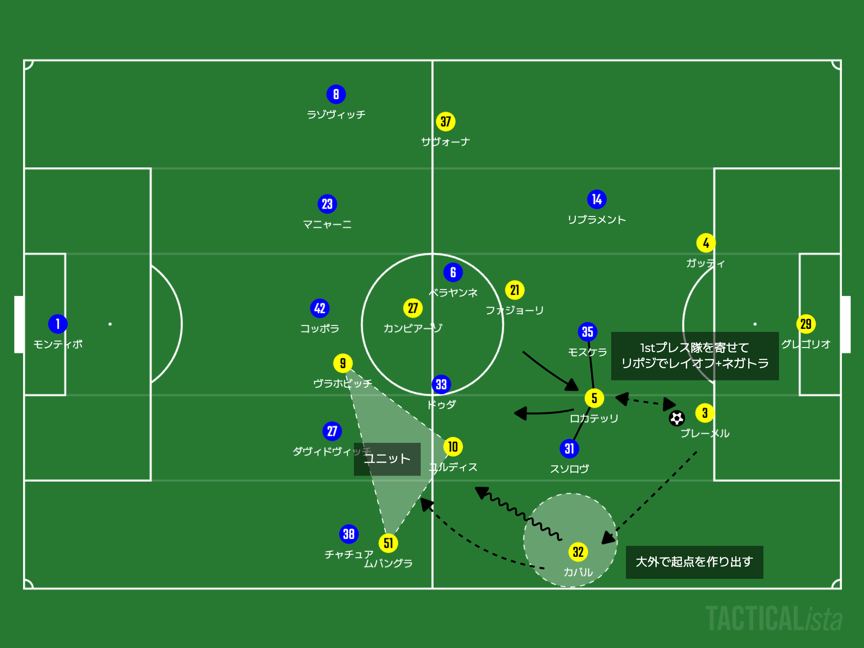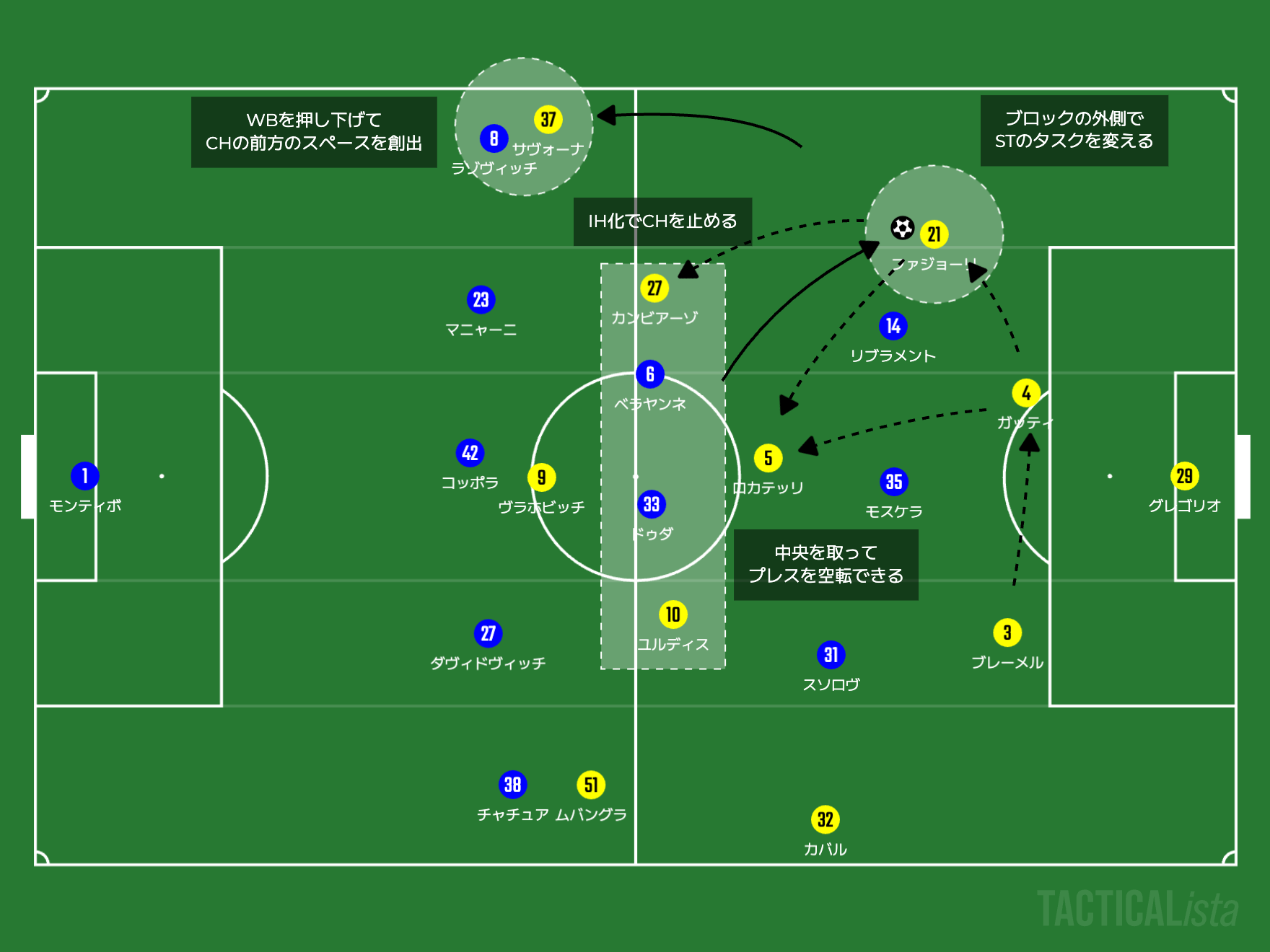 このように1stプレス隊の手前にCHが降りることでプレスの基準をずらすことが多くなっていきます。これを行なった際に、大外のSBがボールを引き取れることが可能になっていきます。このCHとCBのやり取りで時間を作り出すことで、サヴォーナを安全に押し出すこと、カンビアーゾのリンクプレーを促すこと、さらにボールサイドのユニット形成の時間を稼ぐことに繋がっています。