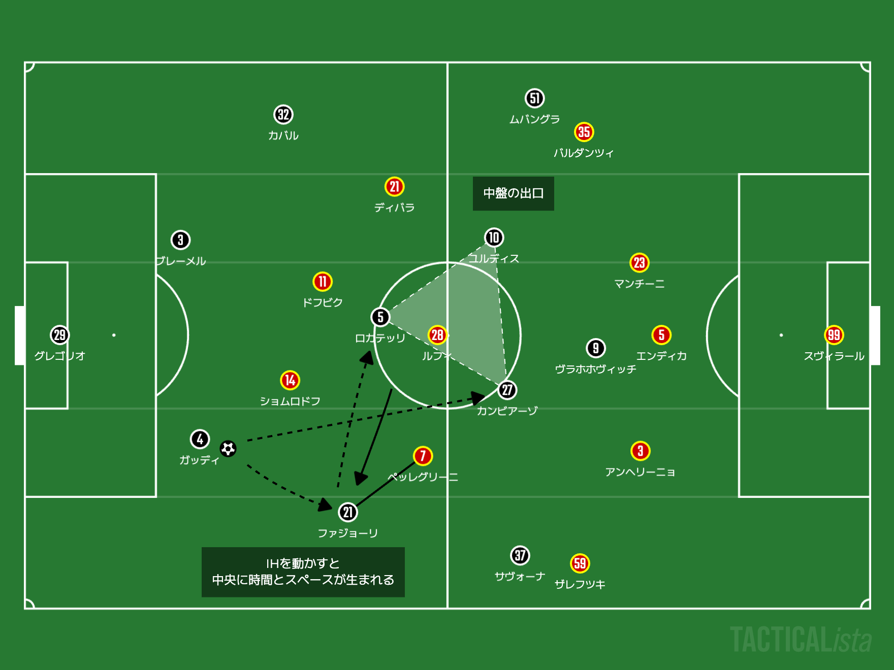 まず1つ目にファジョーリが降りる場所です。サヴォーナを押し出すためにSBの場所に降りることがあります。この際、左SBのカバルは相手のプレス隊の人数によって幅を作るのか、それとも3CB化するのかを選択しています。これによって、1stプレス隊の足を止めて安全に前進しながら、中央のスペースを使っていきます。