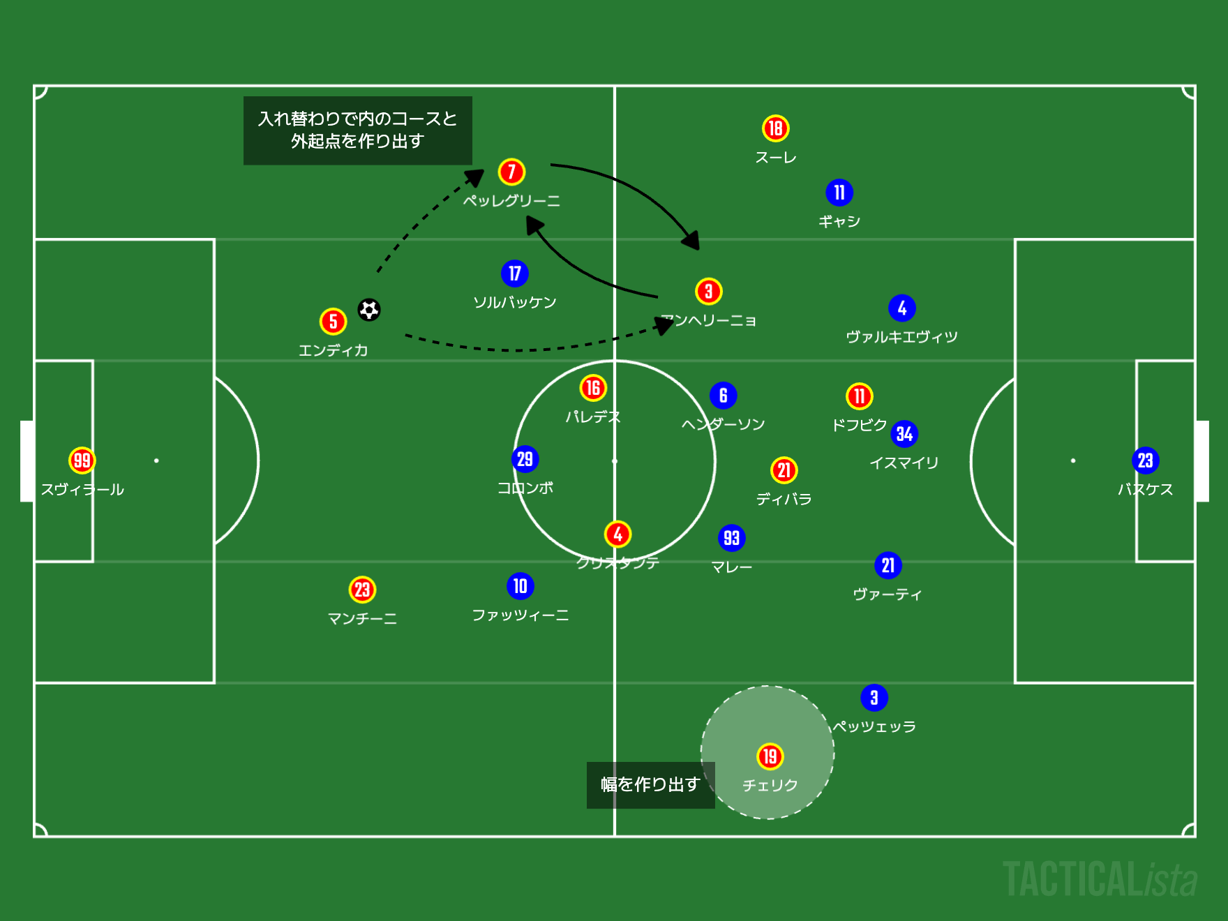 これらを行いながら、相手を動かした瞬間に背後を取っていく速攻と、ディバラを絡めながら押し込んでいくことで崩しを作っていく攻撃を使い分けながらローマはゴールに迫っていきます。