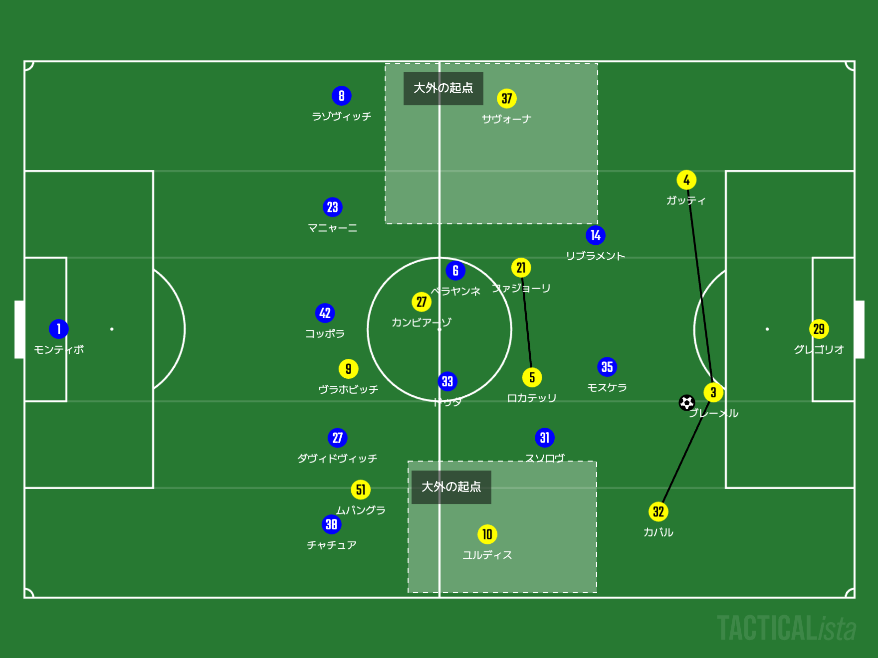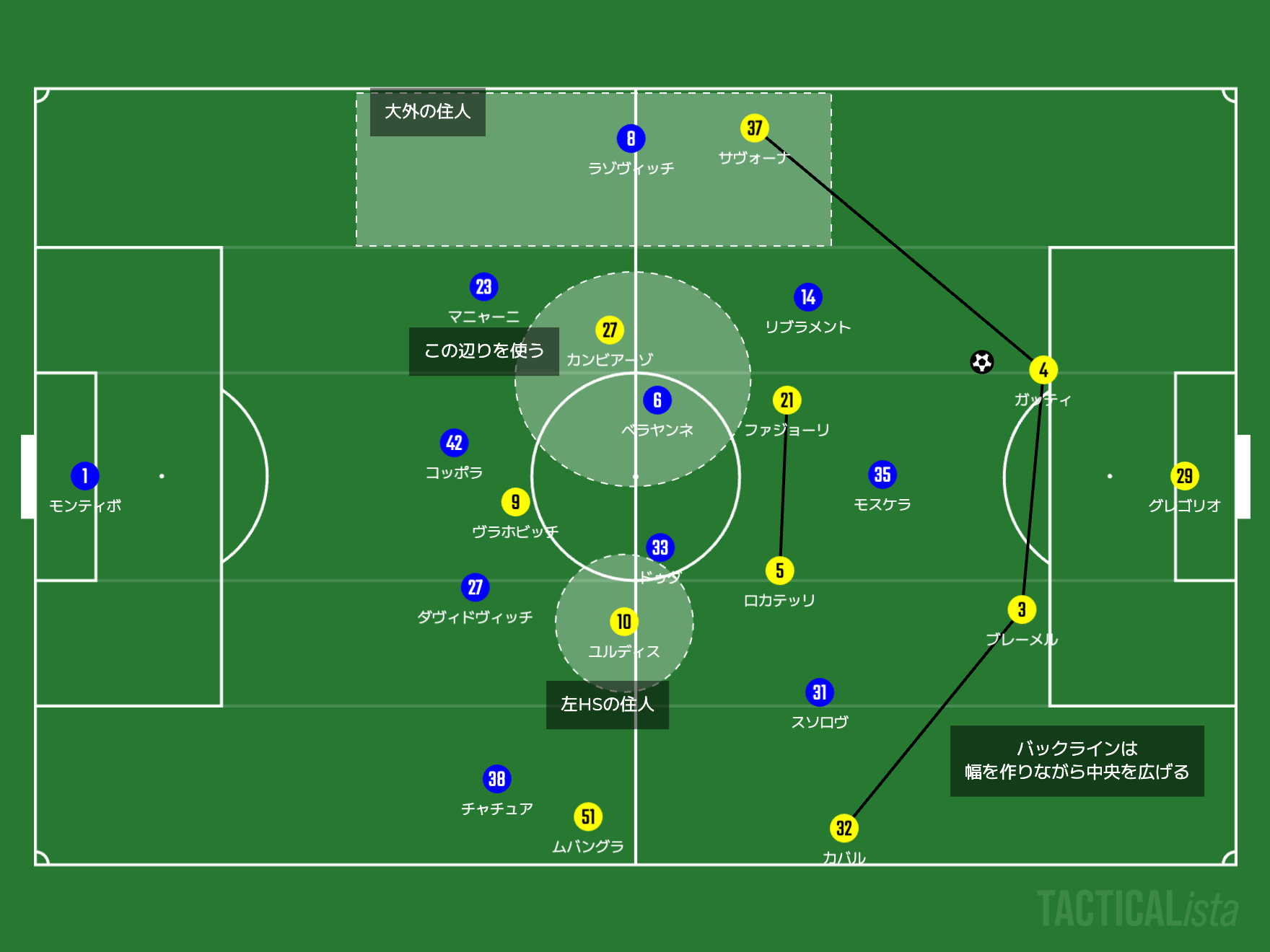 3−2の土台を作りながら大外にユルディスが流れるパターンです。これも相手のプレス隊の人数を見ながら土台を作り出すので、サヴォーナが大外を取ることが可能になり、カンビアーゾを中央のエリアでプレーさせることができています。これによってユルディスを起点に、攻撃を組み立てていくパターンも見受けられました。
