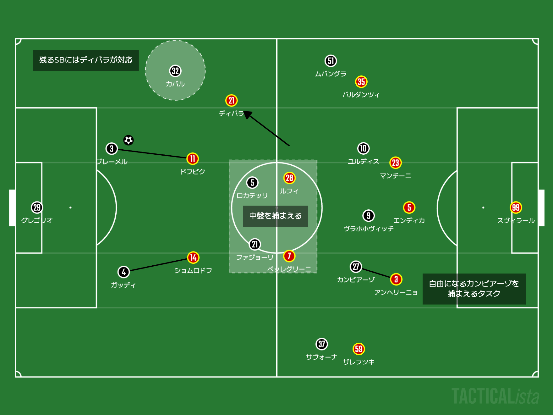 まずCBに対して制限を掛けれるように2トップを採用。さらに3CB化をするSBにはディバラを押し出すことを行いそうです。これを行う意図として、ディバラを前線に残すことで、ボールを奪った先の逃げ道を前方に用意できるからです。またWBを押し下げることによって、マーカーの明確性を保ちます。特にカンビアーゾが自由を得ることが多いので、ここに対してはSBのアンへリーニョ(もしかした担当は変わるかも)をつけていくと予想します。