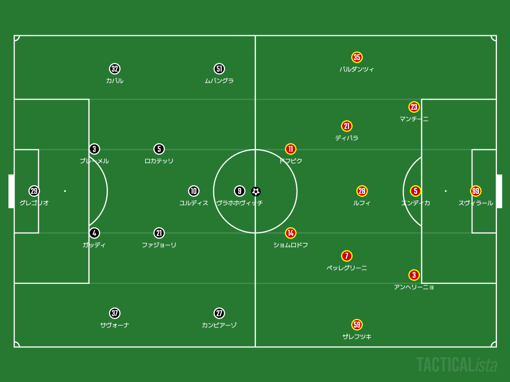 ではローマの前進経路についても触れていきます。ローマも同様に自由にする人を決めながら、前進を行なっていくチームです。先にも触れたようにその選手がディバラとなります。ではどのようにそれを作り出すのか、こちらも前節のエンポリ戦を題材に考えていきます。