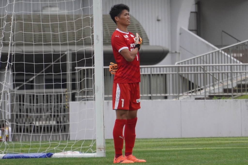 後半1分に神奈川大MF藤田仁朗(3年、兵庫・滝川第二高)をペナルティエリア内で倒してしまい、PKを奪取された。それでも落ち着いた表情を浮かべる守護神は冷静に右方向に跳んで、シュートをセーブした。