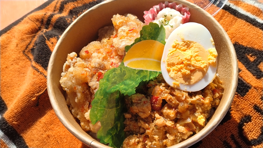 タイグルメその3、タイグルメの王道『ガパオライス』とタイ風唐揚げ『ガイトート』の丼。