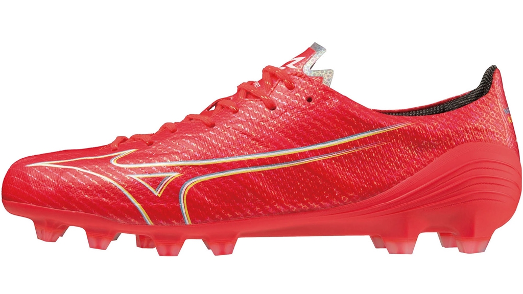 このスパイクは、ミズノフットボール史上もっともスピードを追求したモデル『ミズノ アルファ JAPAN』。しかもフェアリーコーラル×ホワイト×ボルトという市販カラーとなっている。