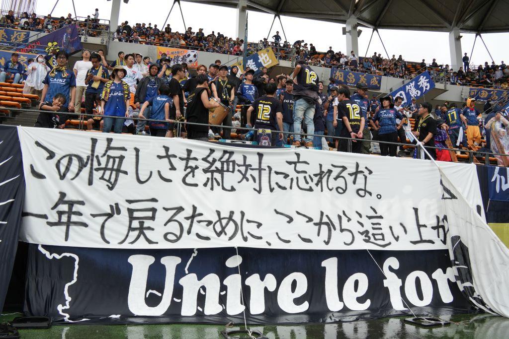 サポーターが掲げた横断幕のメッセージ『この悔しさを絶対に忘れるな。一年で戻るために、ここから這い上がれ!』に応えたかった群馬イレブン。後半アディショナルタイム(AT)には、GK櫛引政敏(くしびき まさとし)を千葉のゴール前まで上げて、セットプレーから同点弾を狙った。