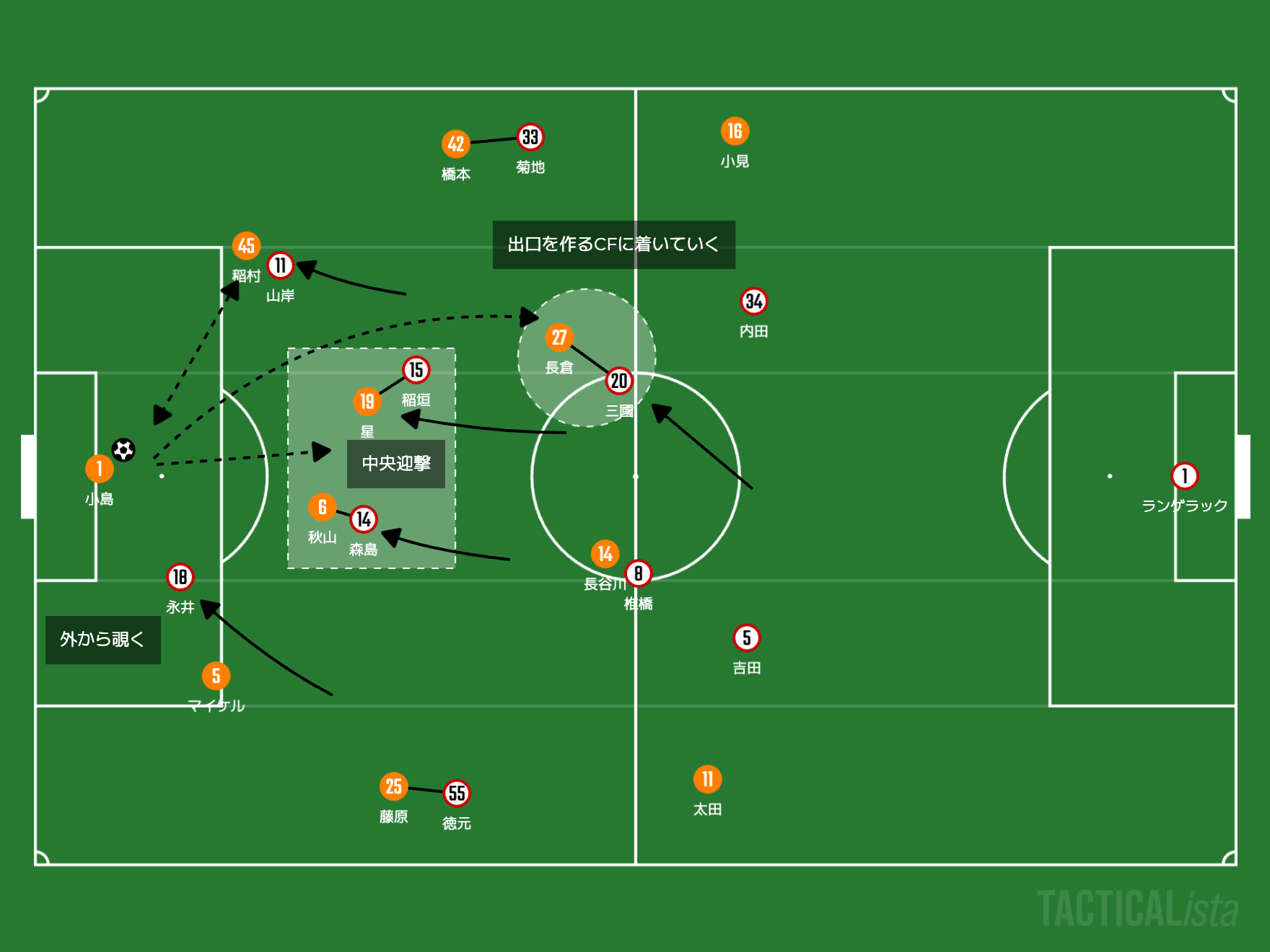 CBには山岸祐也と永井謙佑が担当すると思います。前者はアビスパ福岡で鍛えられたプレスの上手さ、後者は圧倒的なスピードを武器にそれぞれのCBに違った形で制限をかけていくでしょう。これは他の試合でも行っています。