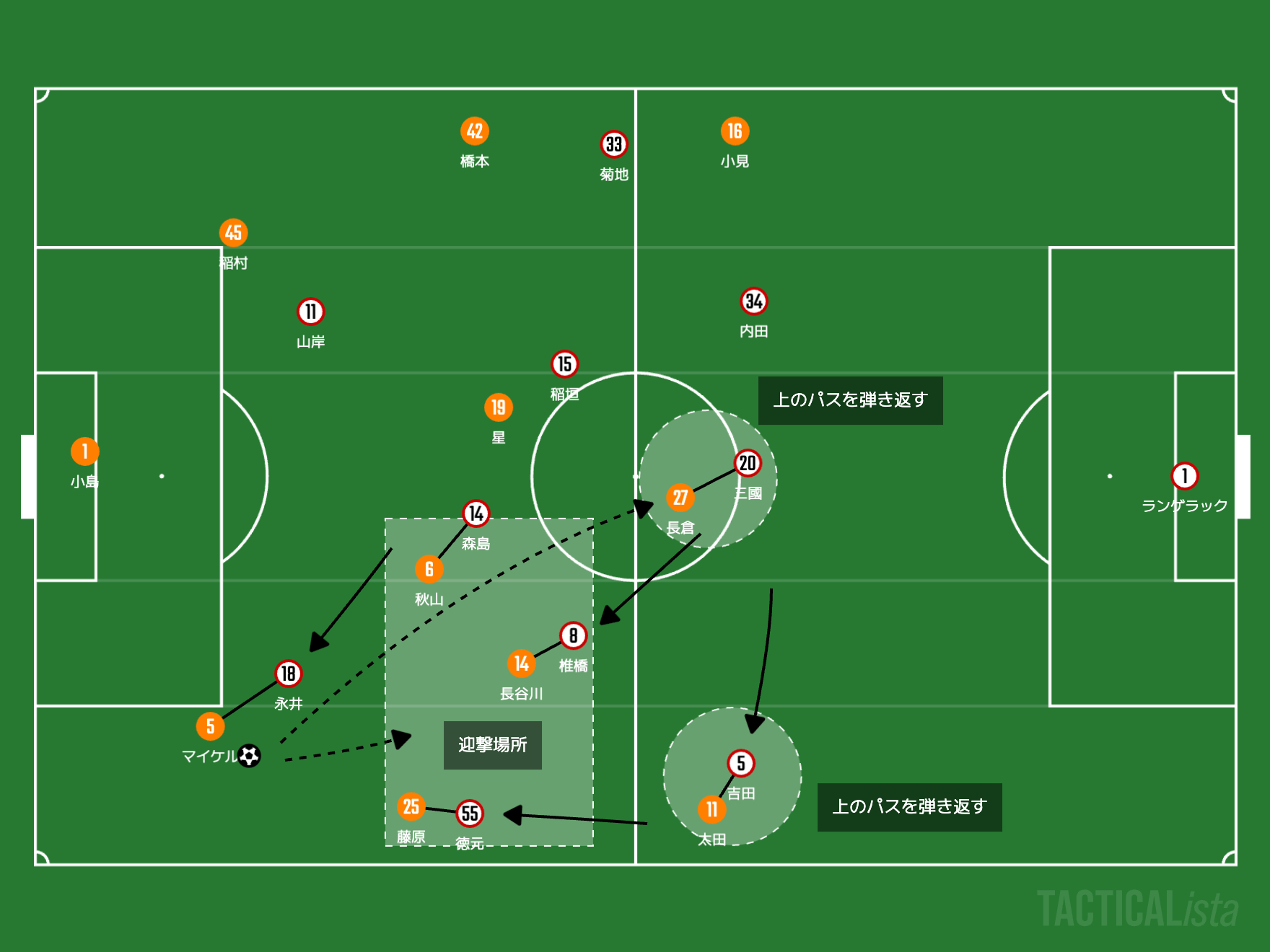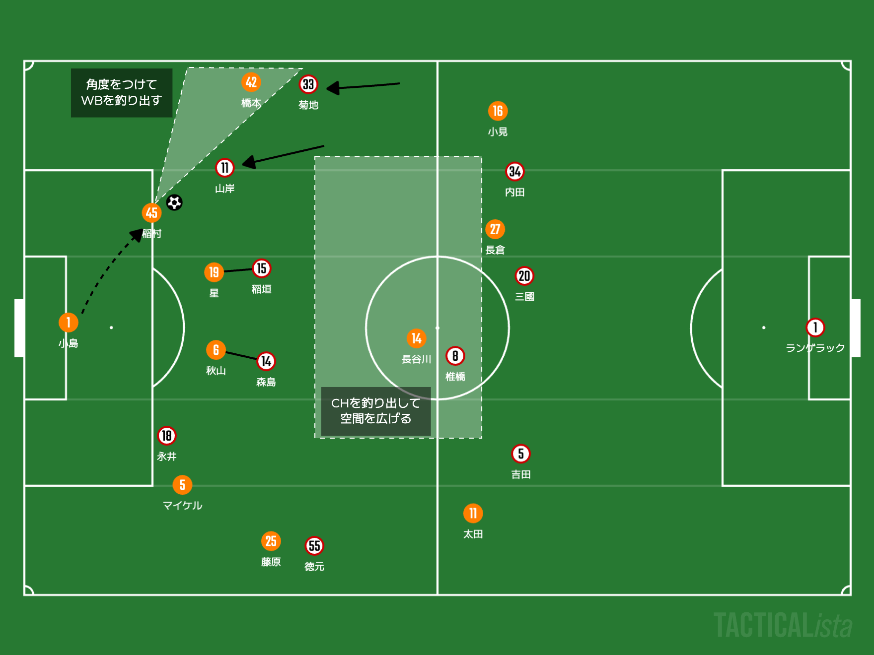 そして縦パスを引き取るのが長倉幹樹や長谷川元希になるでしょう。特に長倉幹樹は予備動作を加えながら、CBの力を利用してターンする技術が存外に上手いです。ここの単独のターンと、CHの列上げによるサポートで、迎撃をいなす、プレスの力を折っていくことは可能になりそうです。