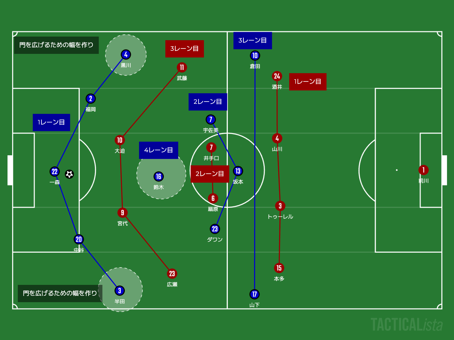 これらを使っていくことができれば、チャンネル(SBとCBの間のこと)攻略とそれに付随するCHのカバーを強制することによってバイタルエリアを使っていくことはできるのではないでしょうか?