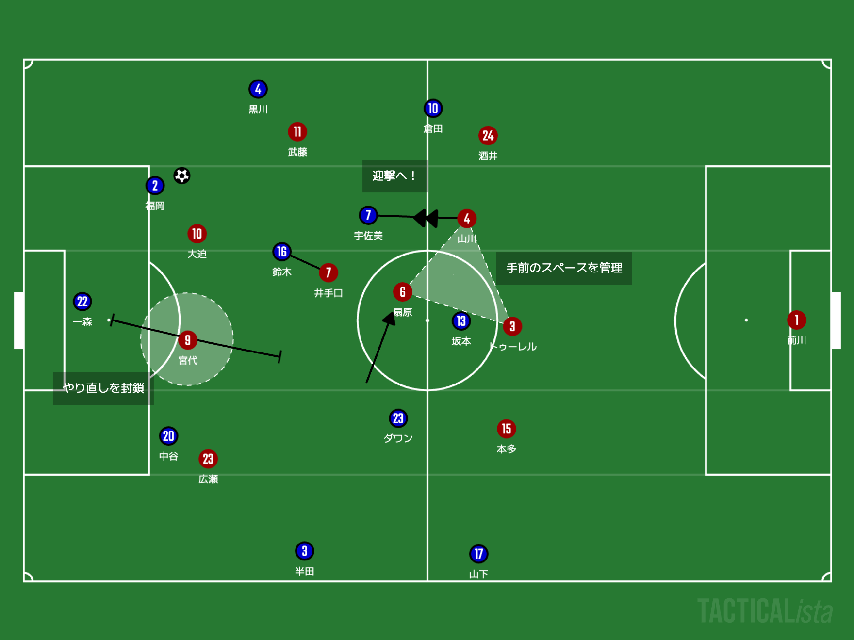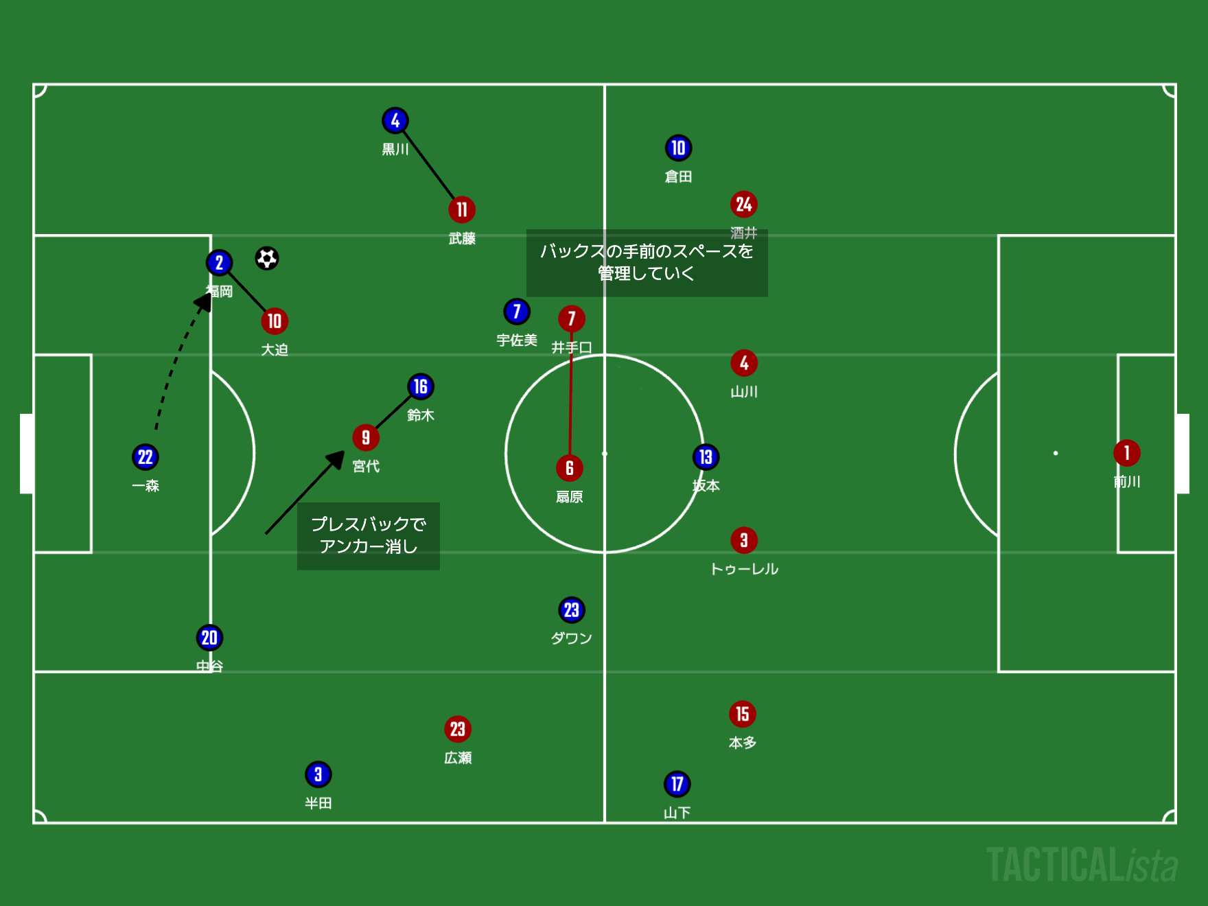 ボールを戻した瞬間に空くであろうバックラインの手前のスペースを大迫勇也や宮代大聖のところに届けてポイントを作っていきたいところです。
