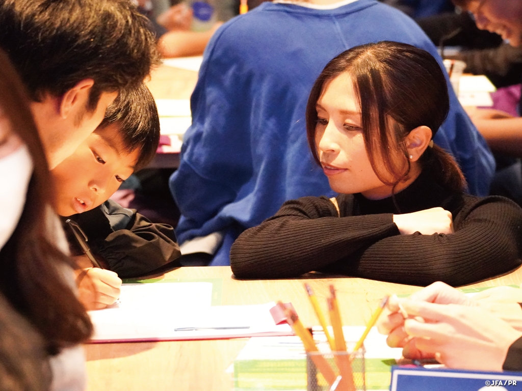 また、小学生だけでチームになって議論しあうグループワークでは、「いきなり移籍トレーニング」というお題のもと、全く新しいチームでプレーすることになった際まず何をしたら良いと思うか話し合い、グループごとに発表した。