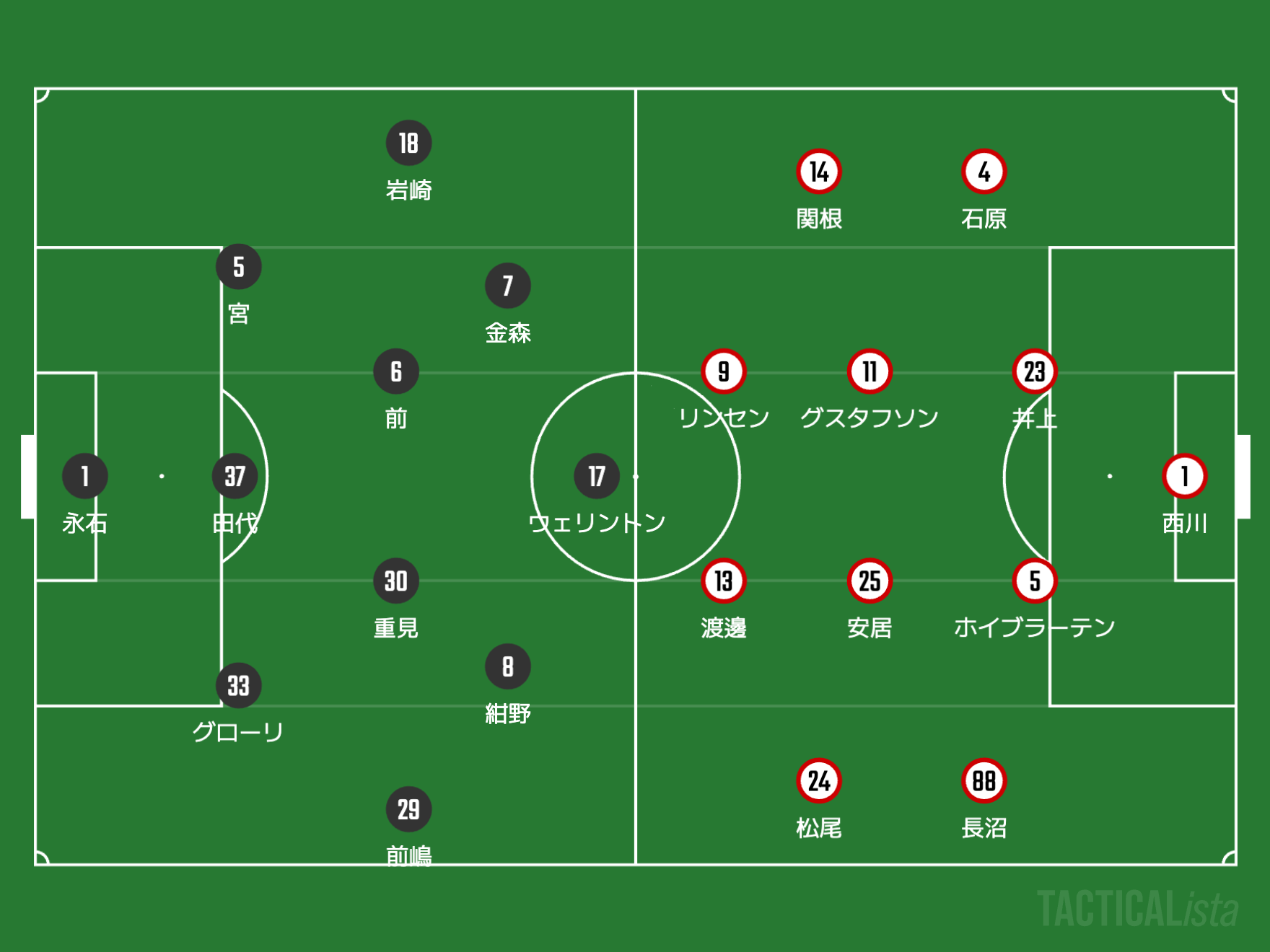 しかし注意したいのがスタートから出てくるであろうサミュエル・グスタフソンです。守備プラン遂行から見事に勝利を収めた36節サンフレッチェ広島戦。この際にサンフレッチェ広島のプレスの基準をズラし続けた、迷いを生じさせ続けたのがセントラルハーフ(以下CH)に入るグスタフソンです。