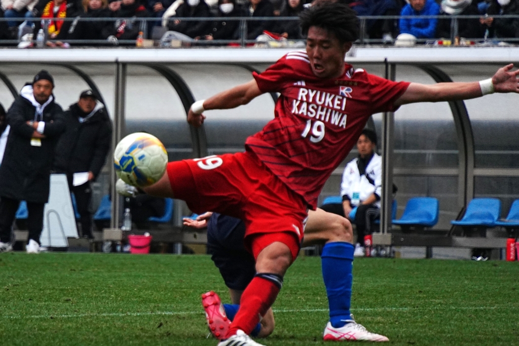 すると後半36分に奈須がロングパスを前線に送り、攻撃のスイッチを入れた。相手DFに弾かれたこぼれ球をFW山野春太(しゅんた、3年-tfaジュニアユース)が頭でゴール前にボールを落とすと、FW粕谷(かすや)悠(ゆう、3年-AZ'86東京青梅)が右足ボレーシュートをゴール左側に突き刺して、流経大柏高が2-1と勝ち越した。