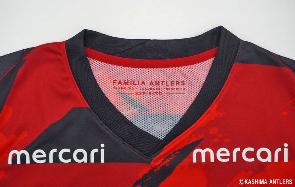 襟の内側には2025シーズンも継続して、アントラーズファミリーの精神でもあるジーコスピリット「TRABALHO(献身)」 「LEALDADE(誠実)」「RESPEITO(尊重)」を刻む。