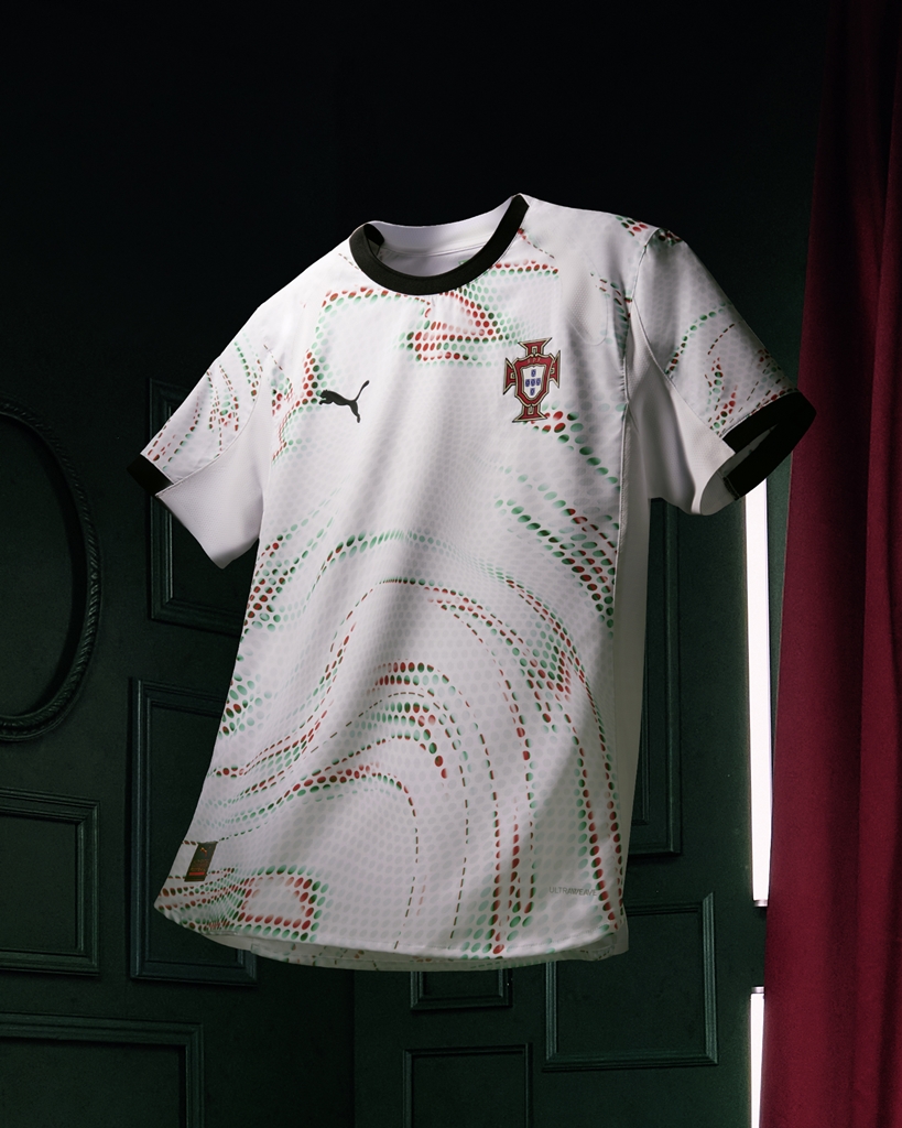 一方、アウェイユニフォームは、現代的な芸術性とポルトガルが持つ「サッカー文化」を近未来的に表現したデザイン。