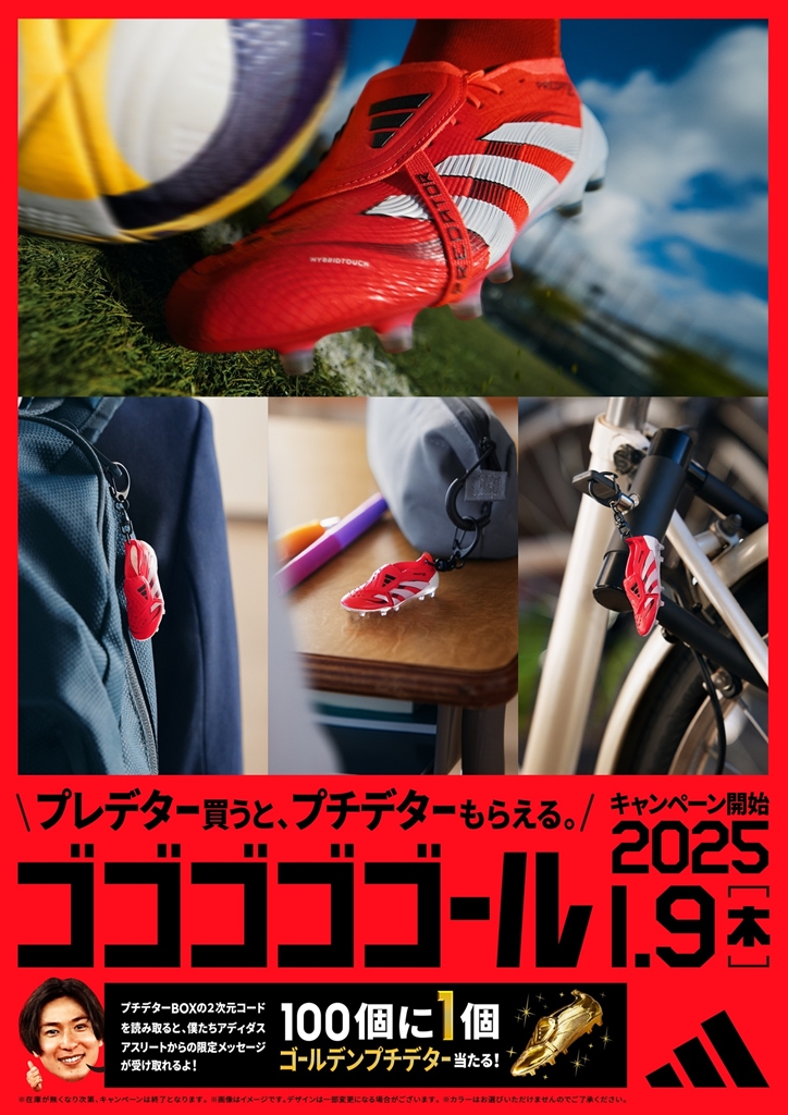 adidas直営店および全国のadidas取り扱い店舗にて、対象のプレデターを購入した方にミニプレデターキーホルダー「プチデター」がプレゼントされるとのこと(※adidasアプリとadidasオンラインショップは対象外)。
