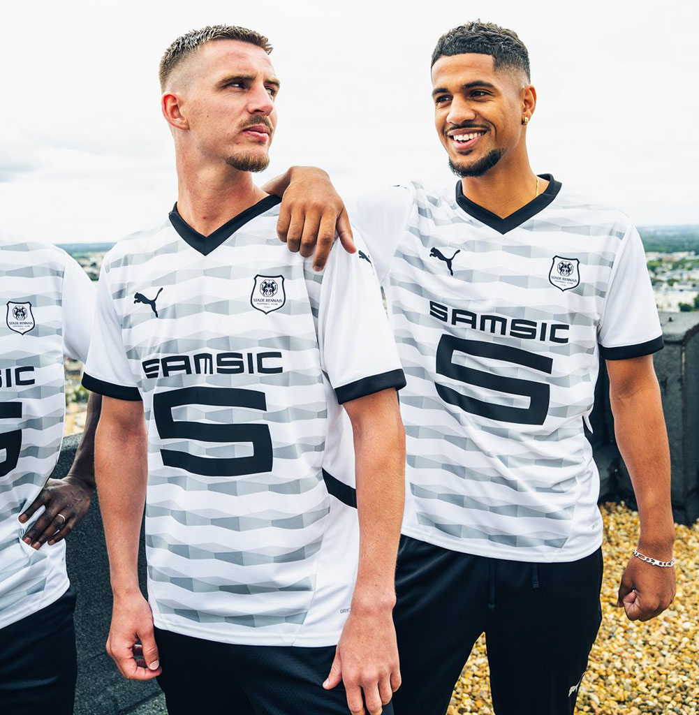 アウェイユニフォームは、ホワイトを基調にブラックを組み合せるカラーリング。この2色はホームタウンであるレンヌの旗・紋章と共通する。ライトグレーで描く幾何学模様は、地元レンヌの建築様式を表したもの。