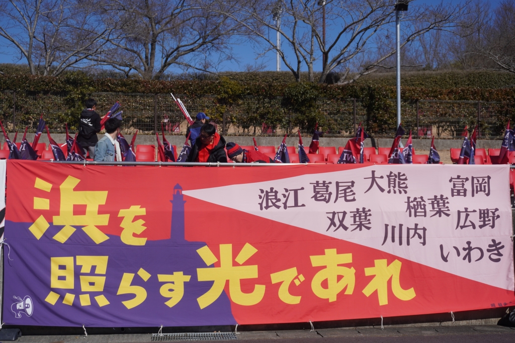 横断幕制作に思い悩む中、若手サポーターの中島さんが『BE THE LIGHT』というゲートフラッグを作っていたことに着想を得て、「光だなと思って、浜と灯台が思い浮かんで、灯台が導き照らす光のような存在になってほしい」と思いを込めて『浜を照らす光であれ』という言葉とともに、灯台の光で浜通り地方の都市名を照らす横断幕を製作した。