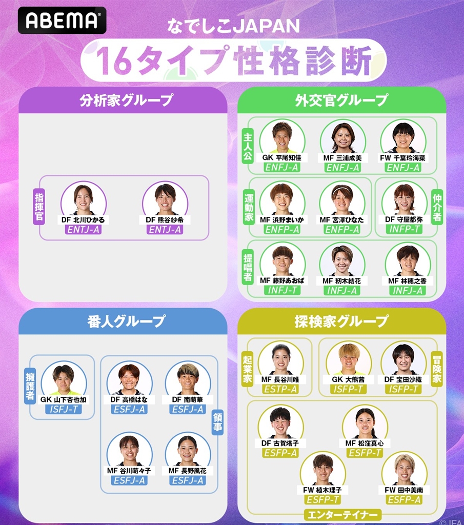 そうしたなか、今大会で日本の3試合を無料生中継するABEMAは、勢いづく新生なでしこジャパン全23選手の16タイプ診断結果を公開している。