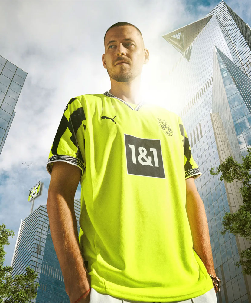 基調色のネオンイエローと袖、襟、肩のグラフィックが特徴的。発色の良いイエローはNikeによってドルトムントに持ち込まれた色である。