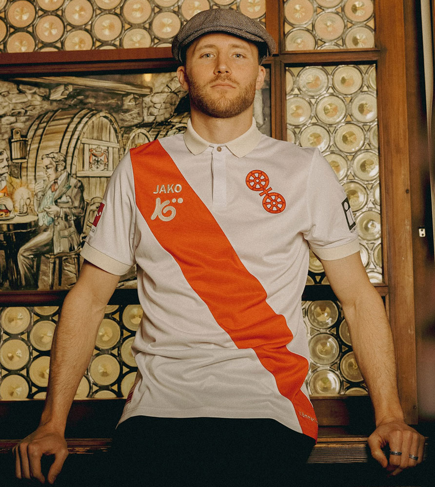 通常は胸に大きくプリントされるスポンサーロゴは、クラブ120年の歴史に敬意を表し右鎖骨に位置を変更。Jakoのロゴと共に刺繍で施された。