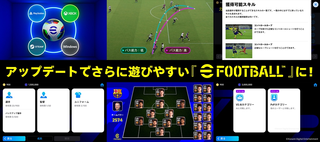 KONAMIは17日、基本プレー無料で家庭用、PC、モバイルで配信中の人気サッカー下む『eFootball™』が、世界累計8.5億ダウンロードを突破したことを発表。合わせて、新要素・新機能を実装するアップデートを実施したと報告した。
