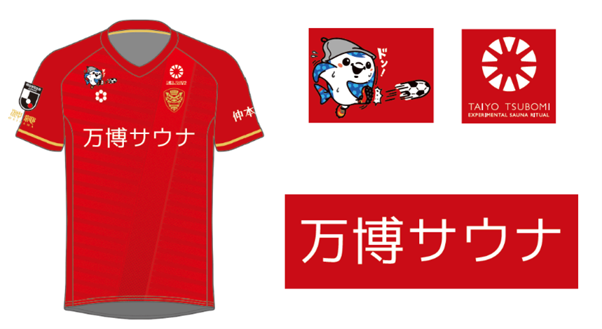 今回のユニフォームでは、鎖骨部分のデザインにサウナハットを被ったFC琉球の公式マスコット「ジンベーニョ」と、「太陽のつぼみ」のロゴマークを配置。さらに、胸部は「万博サウナ」のロゴタイプを掲出した特別デザインになっている。
