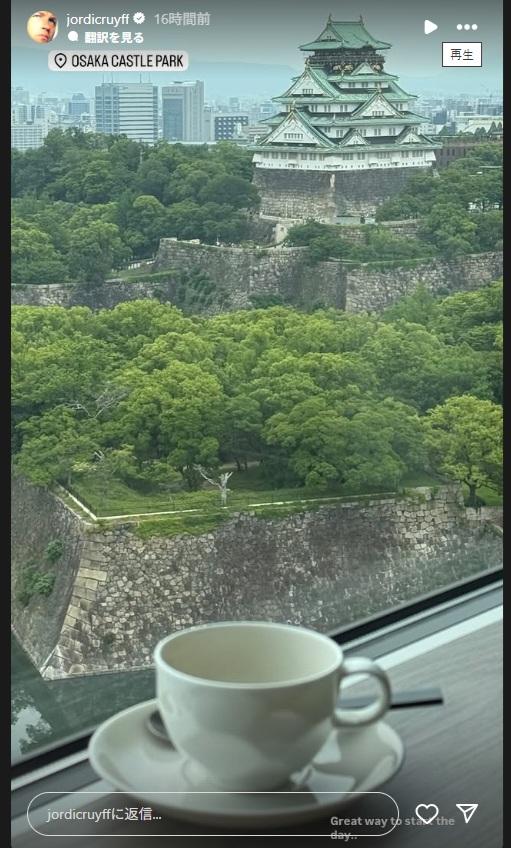 インドネシア代表の戦略アドバイザーであるジョルディ・クライフ氏も「素晴らしい一日の始め方」として、カフェ越しに大阪城の様子を投稿していた。