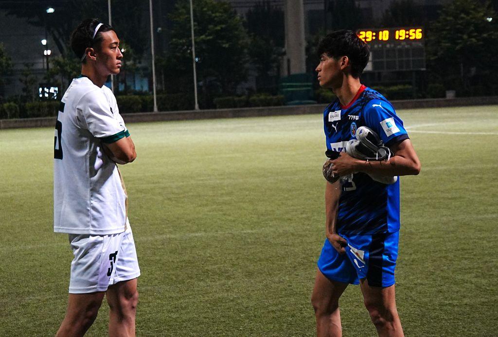 今シーズンより東京農業大から加入したDF弓氣田葵(ゆげた・あおい)は左サイドバックで先発フル出場。かつてジェフユナイテッド千葉U-15でともにプレーしたV市原のFW本吉利安(としやす)とFW佐久間太一と対峙する場面では、身体を張った守備で気迫を見せた。