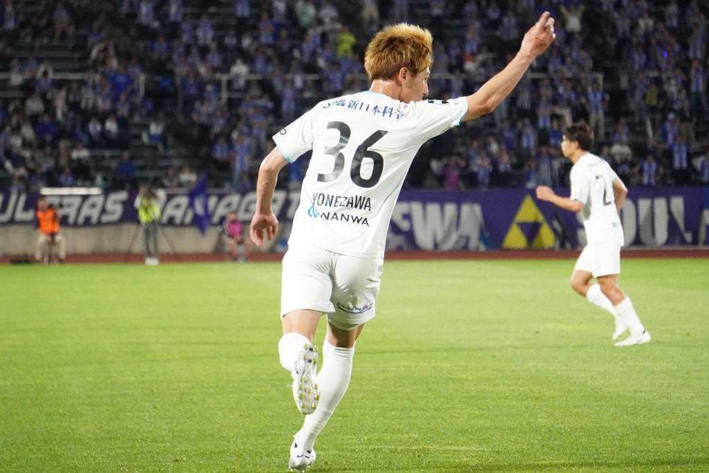 同点弾を挙げた米澤は右腕を高く挙げて、イレブンを戻るように促しながら喜びを分かち合った。