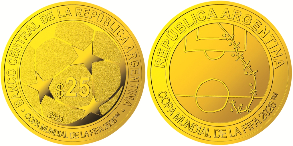 アルゼンチン発⾏の⾦貨と銀貨は、40年のメモリアルとして1986年メキシコ⼤会で同国を優勝に導いたディエゴ・マラドーナが準々決勝で決めた伝説的な「5⼈抜きゴール」がモチーフ。ハーフラインからゴールまでのドリブルやボールの軌跡を描いたユニークなデザインとなっている。