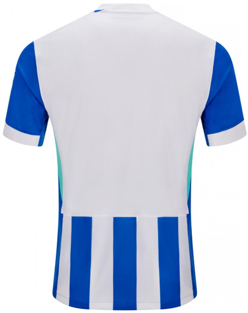 「青地に白文字」の胸スポンサーロゴはブライトンでは少数派。胸部を境に配色が上下で互い違いとなる“ズレるストライプ”もユニークで、一見クラシックだが実は大胆で斬新なデザインだ。