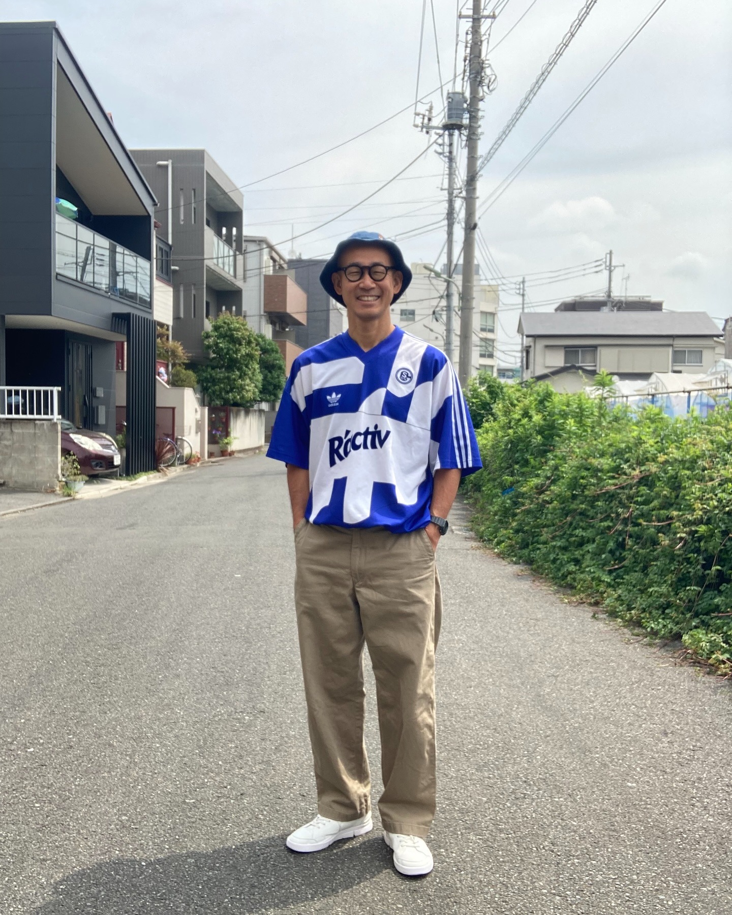 最初にご紹介するのは、サッカー元日本代表の内田篤人氏も所属していたドイツのクラブ「シャルケ」のユニフォームをチノパンと合わせたコーディネート。シャルケのユニフォームはデザイン面の評価が高く、世界中のマニアから根強い支持。それにベーシックなチノパンの組み合わせ。ユニフォームを街着にというと、派手なウェアを想像しがちですが、あえて白とブルー2色のチームをチョイスしたことが、このスタイリングの“勝利ポイント”。