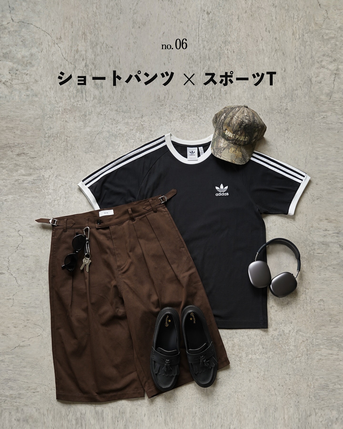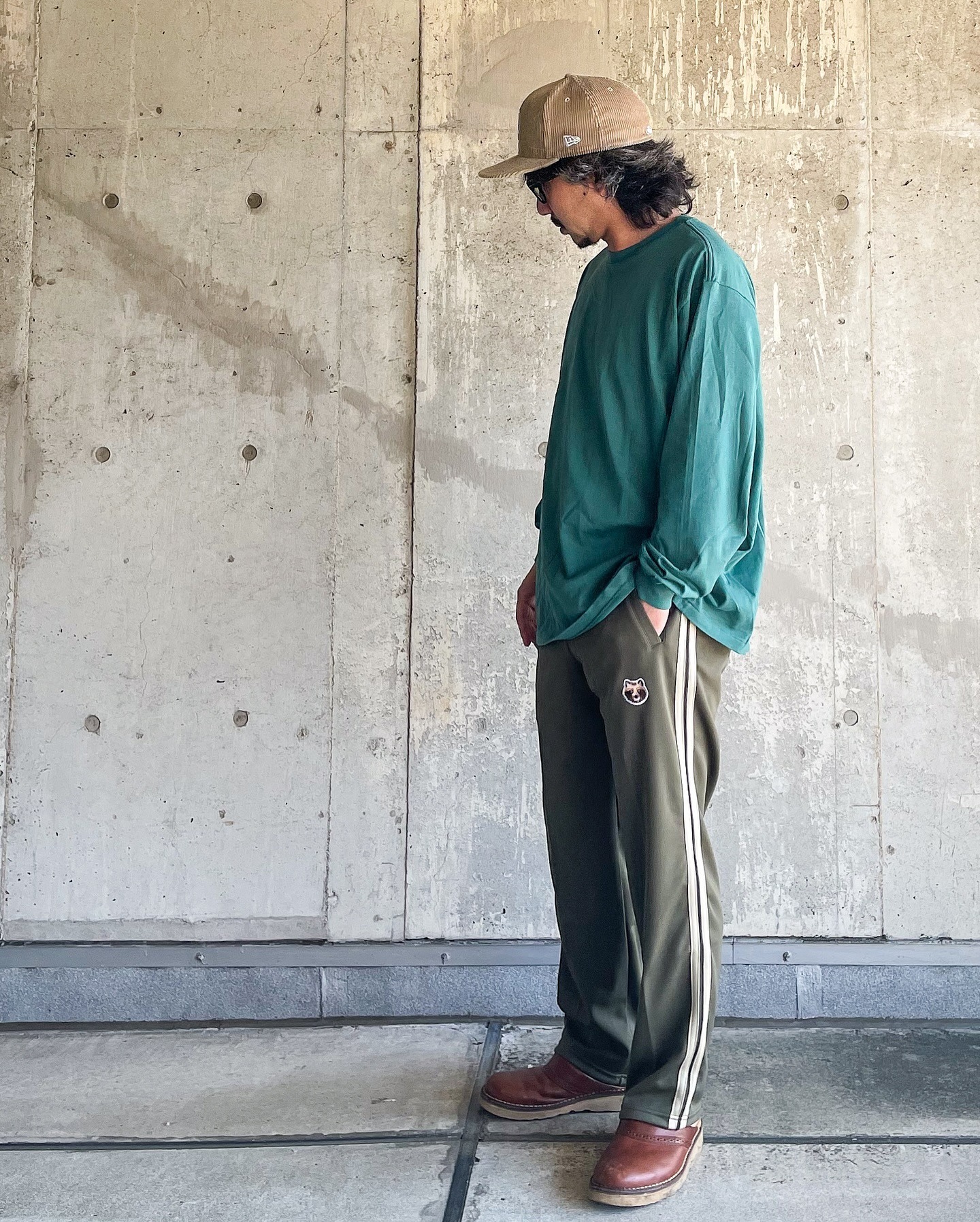 続いてご紹介するのは、スポーツ服の定番・ラインジャージー使い。ラインウェアの鉄板【adidas】の3本線トップス。こんなトレーニングウェアも、今季はオシャレな街着になるんです。あえて、ローファーなどのトラッドなシューズを選んで、トップスと足元を対照的に仕上げるのがコツ。下の写真のようにボトムスにラインジャージーを持ってくるのも、ありです。これなら、おじさんにも、簡単に実践可能では⁉