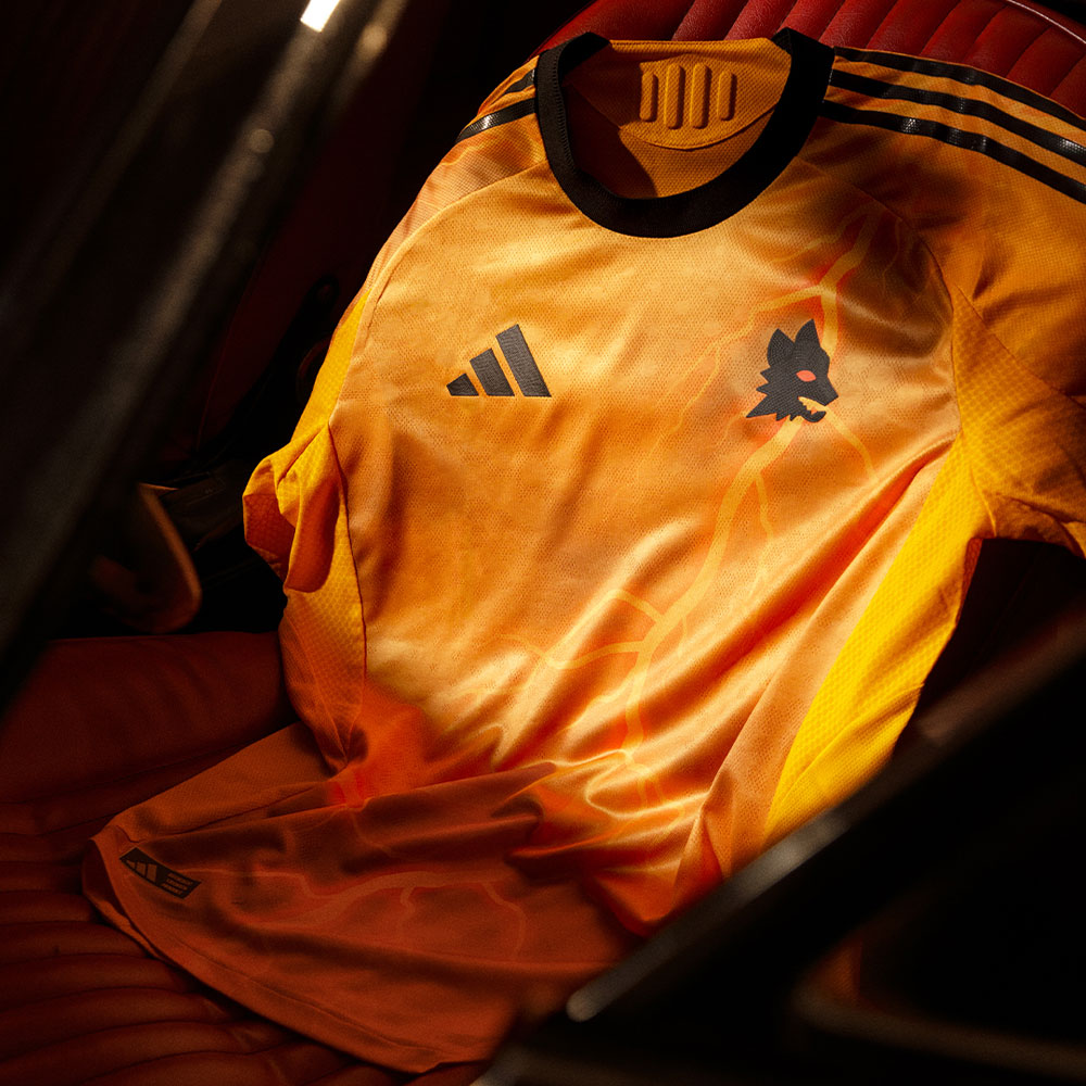 ローマのアウェイといえばホワイトが定番で、オレンジは時代によってサードに使われてきた色。慣例を破ってまでこの色をアウェイに採用した理由は、デザインのコンセプトにあるのかもしれない。
