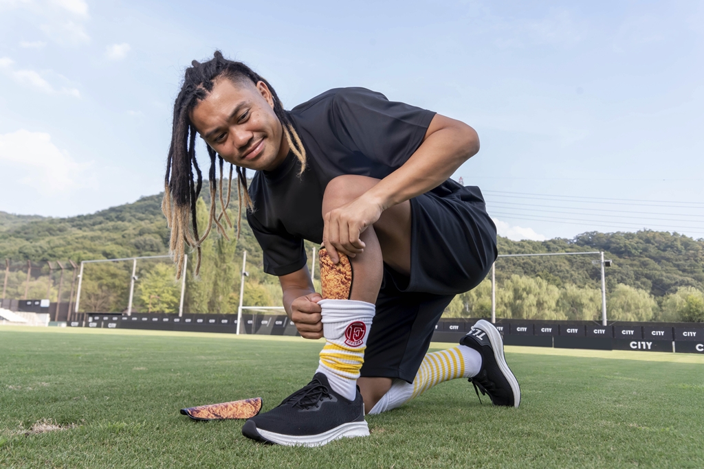 今回、「ファミチキ あげあげ祭」応援隊長に就任した田中は、キャンペーンで抽選で当たるオリジナルグッズのひとつである、ファミチキをモチーフにデザインされた「すね当て&ソックス」を実際に着用。