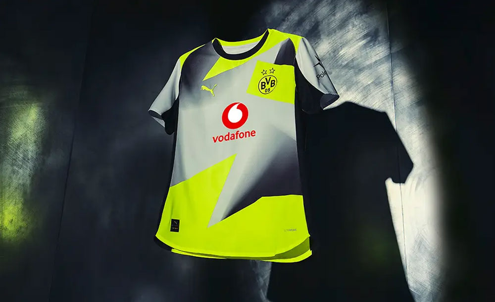 新アウェイユニフォームは、ライトグレーを基調にブラックとイエローを組み合わせる配色。今作のイエローは、90年代のドルトムントのユニフォームに使われていた蛍光イエローの色味に近い。