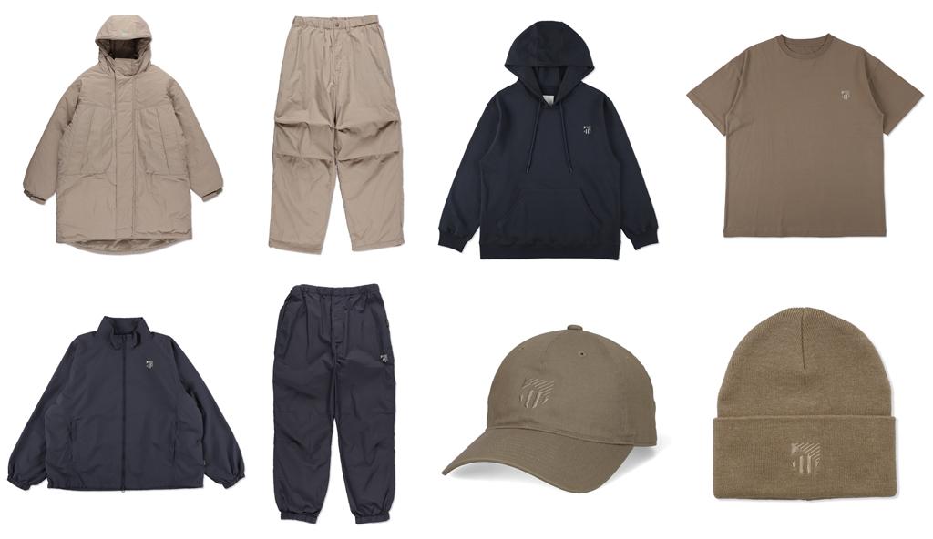 ラインナップは、パフ・フーデッド・コート、フリース・ジャケット、トラック・ジャケット、各種ボトムス、Tシャツ、キャップなど全11型で、ネイビーとトープの2色展開。価格帯は5,280円~52,800円となっている。