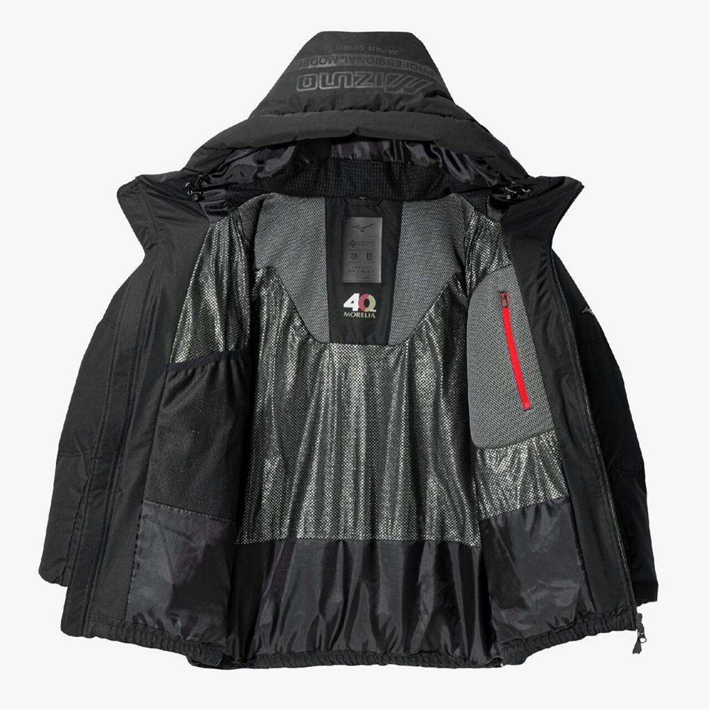 ジャケットの内側はこんな感じ。ミズノのテクノロジーであるブレスサーモと、輻射熱効果のあるリフレクションギアを搭載しており、効率よく保温性を高めている。