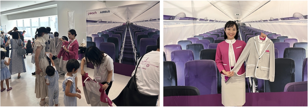Peachブースに来場した人は、Peachの制服を着てフォトパネルの前で撮影することが可能。制服は子供から大人まで、女性・男性を問わず体験することができるという。